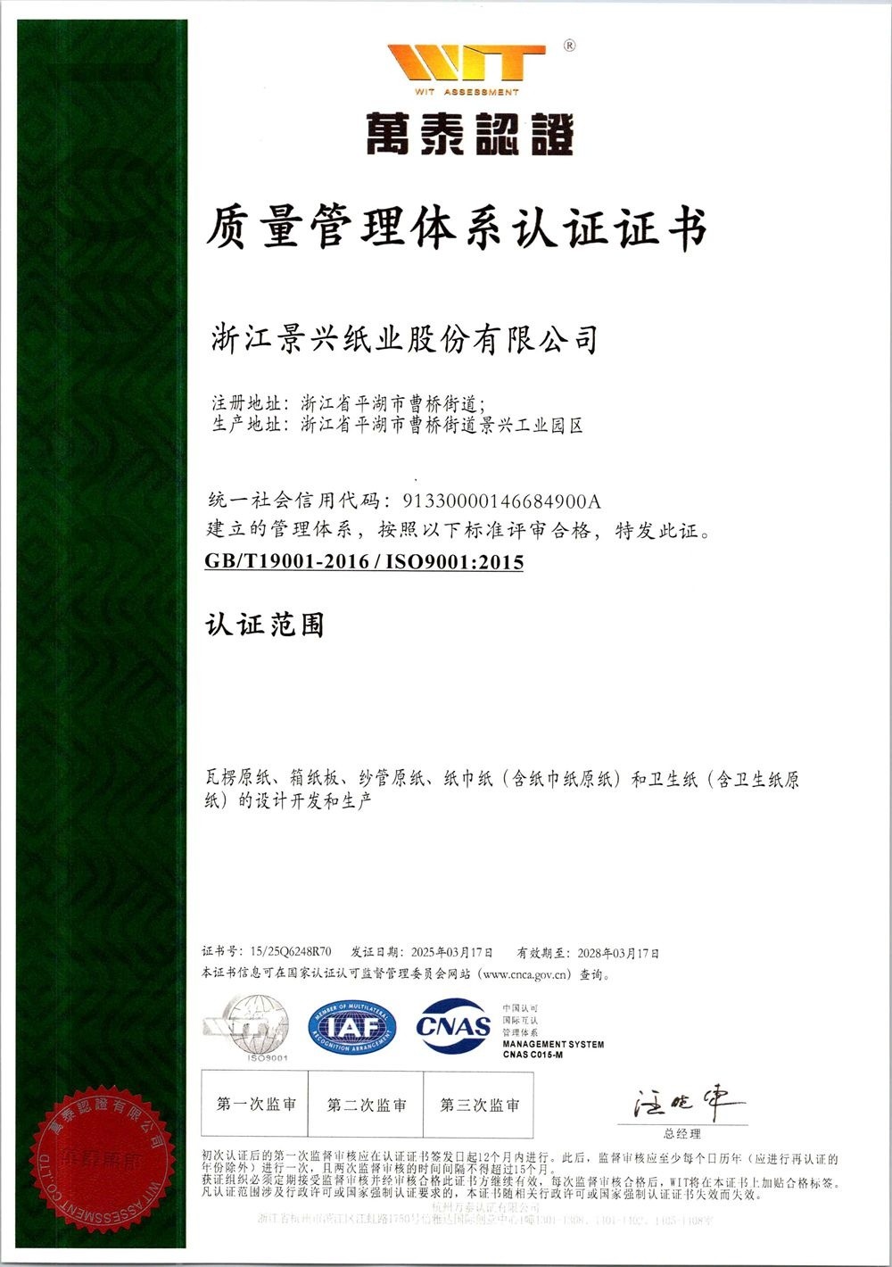 太阳集团官网于1996年率先在同行业通过ISO9001质量管理体系认证,2002年通过ISO14001环境管理体系认证,2014年通过OHSAS18001职业健康安全管理体系认证,2015年通过GB/T23331能源管理体系和FSC®森林体系认证,2018年通过两化融合管理体系认证。